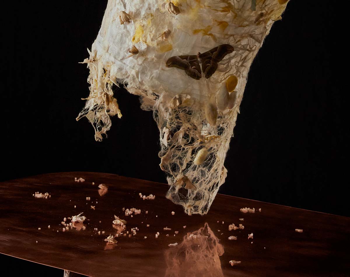 Utställningen presenteras i form av projektioner och ett ljudlandskap av silkesmaskar i en textilinstallation som bjuder in besökaren till en sammanvävning och ett uppvaknande. I mörkret: en rytmisk ritual. Om dagen: en inkapslad tillflykt vävd för stillhet, paus och pollinering.